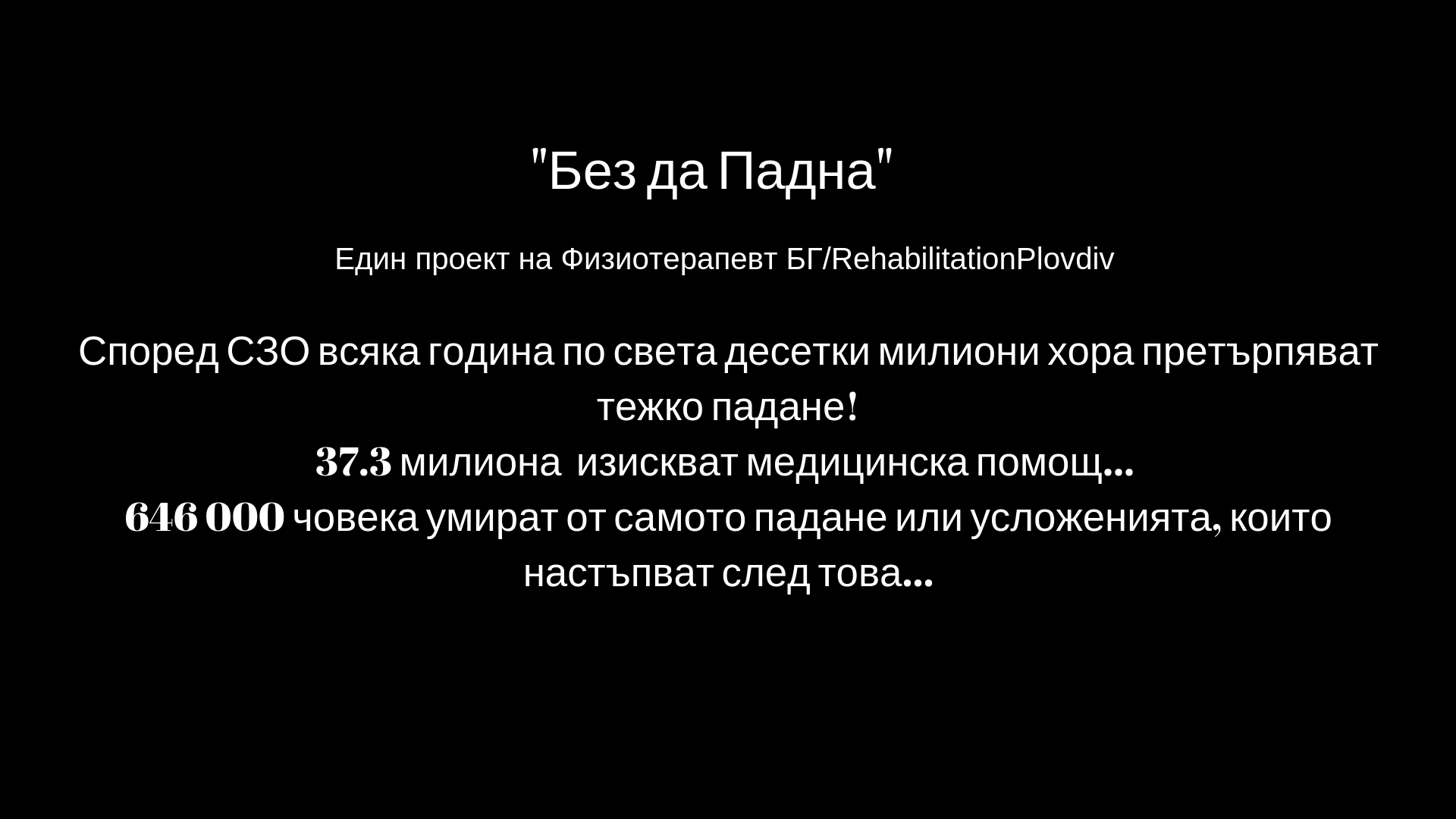Добре дошли в нови отворен проект на Физиотерапевт БГ/ Rehabilitation Plovdiv. Името ми е Димитър Христев. Аз съм терапевт, който живее и работи в град Пловдив. Списвам блога physiobg.com и също така снимам клипчета за видеоканала Rehabilitation Plovdiv. През последните няколко години на моето обучение и работа забелязах една плашеща тенденция. За проблемите след големи операции, хронични заболявания и състояния НЕ СЕ ГОВ0РИ системно, последователно и добре аргументирано. Паданията отнетам стотици хиляди животи всяка година в световен мащаб. Десетки миолини хора търсят медицинска помощ поради падания (виж тук). Те могат да доведат до травми, хронична болка, залежава, влошено качество на живот и смърт. #БезДаПадна ще е уебсайт, в който ще се говори за тези неща. В него ще се публикува адекватна информация, с която да се освети този проблем. Стратегии за справяне, ако вече сте падали веднъж.